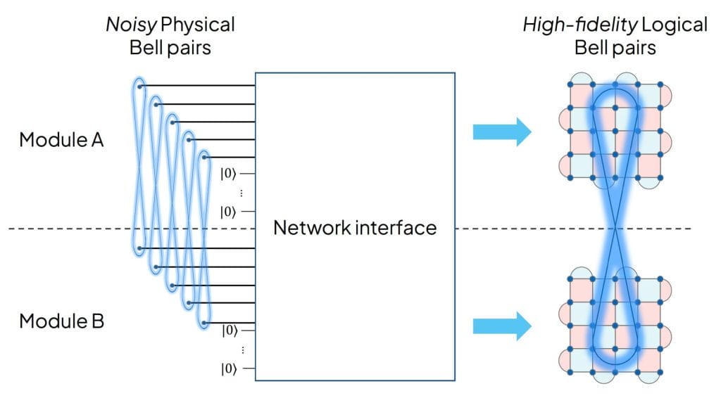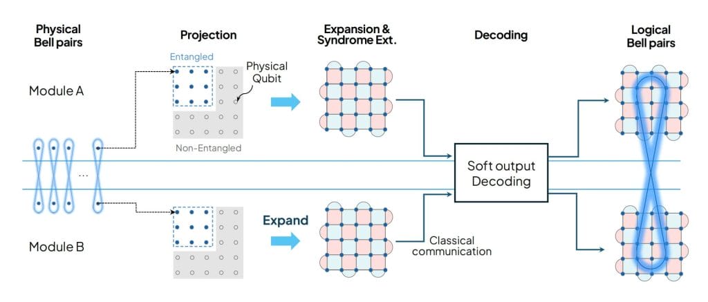 In our latest work, we introduce Entanglement Boosting, a network-interface protocol that achieves the “best of both worlds” [4]. By employing a strategic three-stage process, we transform physical remote entanglement into logical Bell pairs with error probabilities as low as one-in-a-trillion: