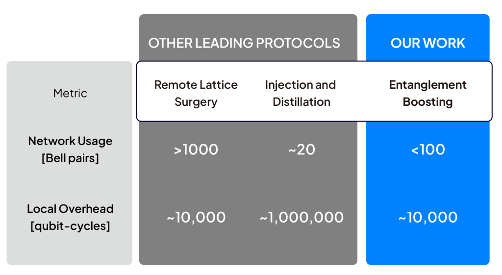 At NanoQT, our mission is to resolve this bottleneck through building high-performance cavity-assisted interconnect hardware and developing the underlying protocols and architectural mechanisms that minimize resource overhead– such as qubit counts, entanglement consumption, and computation time. This strategy builds upon our scalable distributed quantum computing architecture [3], with our most recent breakthrough in entanglement boosting—highlighted in this post—providing the critical implementation path [4].